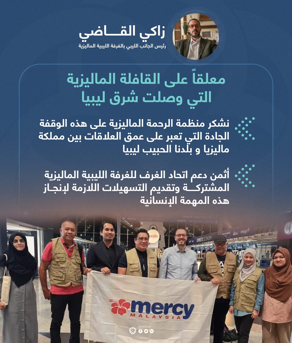 قد تكون صورة ‏‏‏١٠‏ أشخاص‏ و‏تحتوي على النص '‏زاكي القاضي رئيس الجانب الليبي بالغرفة الليبية الماليزية معلقاً على القافلة الماليزية التي وصلت شرق ليبيا نشکر منظمة الرحمة الماليزية على هذه الوقفة الجادة التي تعبر على عمق العلاقات بين مملكة ماليزيا بلدنا الحبيب ليبيا أثمن دعم اتحاد الغرف للغرفة الليبية الماليزية المشتركة وتقديم التسهيلات اللازمة لإنجاز هذه المهمة الإنسانية ALAYSIA mercy CLUCY 器00°‏'‏‏